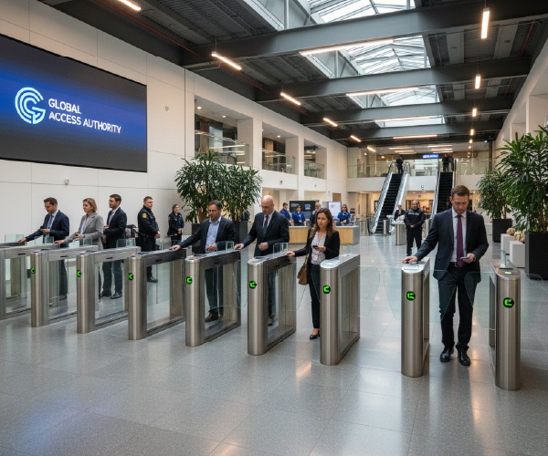 Rotor Central: En el centro de cada pasillo hay un rotor giratorio compuesto por múltiples barras verticales (tipo molinete o aspa). Estos rotores son el mecanismo principal que permite el paso de una sola persona a la vez. En la imagen, los rotores están en una posición que bloquea el paso, listos para girar una vez que se concede el acceso.